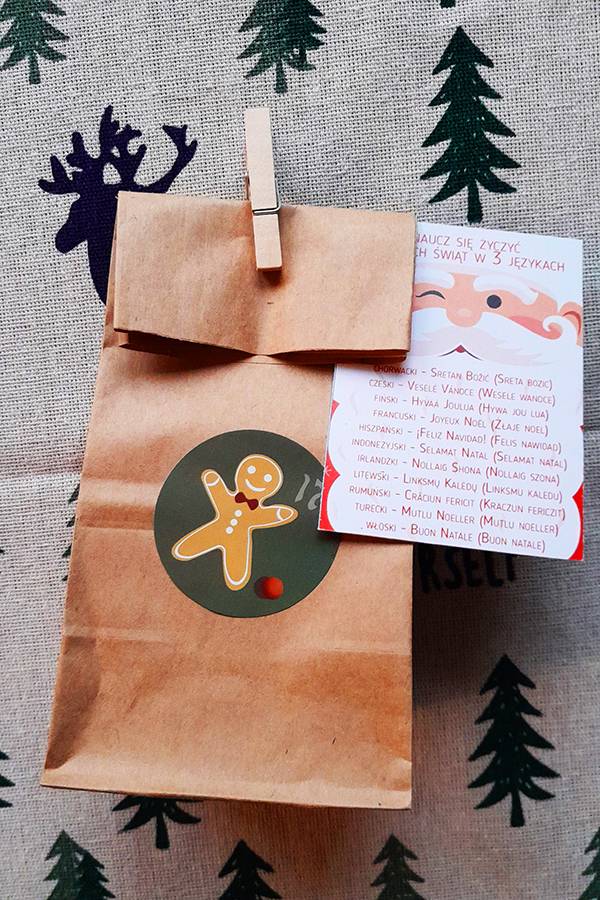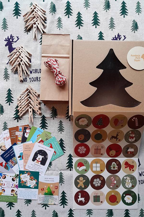 W zestawie znajdziesz 24 torebki, karteczki z zadaniami i ciekawostkami, klamerki, dwukolorowy sznurek, naklejki z numerkami. Całość zapakowana zostanie w świąteczne opakowanie.