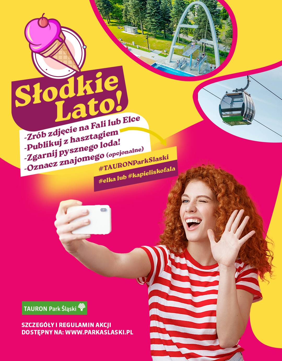 Zrób zdjęcie na kąpielisku albo w gondoli lub na krzesełku Elki i opublikuj je na swoim publicznym profilu na Facebooku lub Instagramie. Pamiętaj, aby oznaczyć profil @tauronparkslaski (na Facebooku) lub @tauron.park.slaski (na Instagramie), dodać oznaczenie jednej osoby ze znajomych (opcjonalnie) oraz użyć hasztagów: