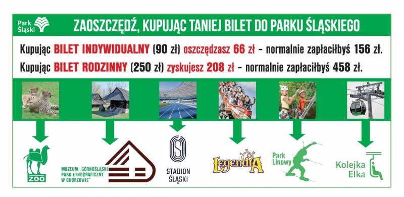 W 2018 roku po raz szósty do obiegu trafia bilet na prawie wszystkie większe atrakcje, z których można korzystać w Parku Śląskim. Raz zakupionej wejściówki można używać od maja do września. Nabywca oszczędza sporo czasu w kolejkach, ale i pieniędzy. W przypadku wejściówki dla jednej osoby za 90 złotych, można zaoszczędzić 66 zł (zakupione osobno bilety na wszystkie z oferowanych atrakcji, to koszt 156 zł), a w przypadku biletu rodzinnego za 250 złotych – 208 zł (zakupione osobno bilety dla całej rodziny, to koszt 458 zł).