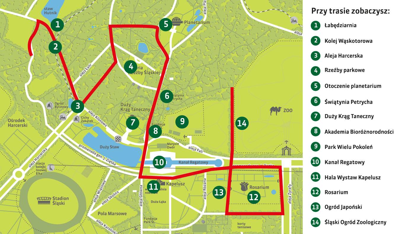 Trasa Jessiki zaczyna się na ścieżce przy Końskiej Łące. Biegacze mijają m.in. Duży Krąg Taneczny, kąpielisko Fala, Rosarium i ogrodzenie Śląskiego Ogrodu Zoologicznego. Mogą więc oglądać miejsca, które są wpisane w program rewitalizacji Parku Śląskiego.