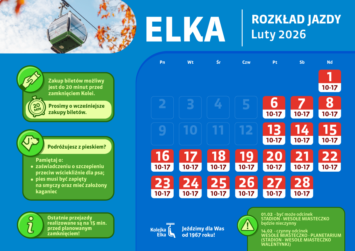 W związku z budową trzeciego odcinka Kolei Linowej Elka w dniach 31 stycznia i 1 lutego kolejka nie będzie kursować na trasie Stadion Śląski - Wesołe Miasteczko. Zapraszamy jednak do skorzystania z działającego odcinka: Wesołe Miasteczko - Planetarium, który będzie dostępny bez zmian. W sobotę i niedzielę Elka będzie jeździła w godzinach 10:00-17:00.