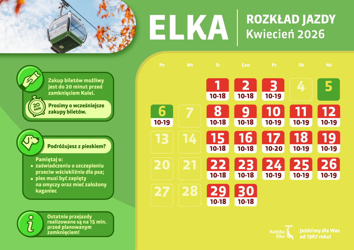 Ważne ogłoszenie: Uprzejmie informujemy, że biletomaty Kolei Linowej Elka wyłączają się automatycznie 20 minut przed zamknięciem. Prosimy o wcześniejsze zakupy biletów. Dziękujemy za zrozumienie.