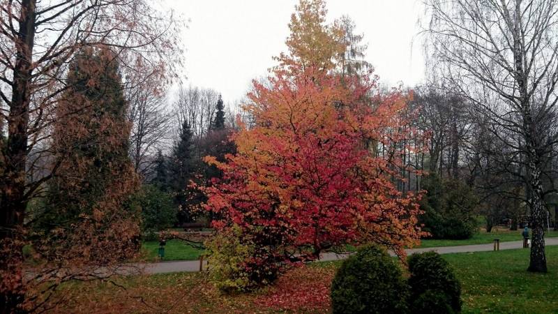 O tej porze większość liści już opadła, jednak jest jedna roślina, która zachowała swoje piękne, czerwone kolory.To ambrowiec amerykański, który przebarwia się bardzo późno, a liście na nim utrzymują się dosyć długo. W Parku Śląskim ambrowiec rośnie m.in. przy budynku dyrekcji oraz w Cichym Zakątku.