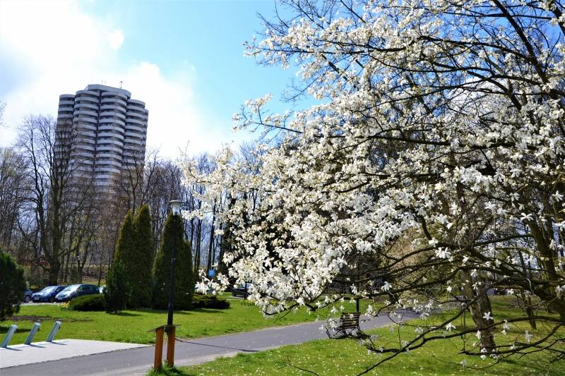 W Parku Śląskim zakwitły magnolie i wiśnie