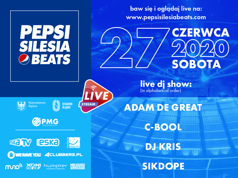 Pepsi, Stadion Śląski oraz PMG Group przedstawiają muzyczny projekt jakiego jeszcze w Europie nie było! Pepsi Silesia Beats to trzy wakacyjne edycje imprezy w formacie VIDEO LIVE STREAM dostępnej dla fanów muzyki elektronicznej i wszystkich, którzy kochają tańczyć! Pierwsza edycja wydarzenia odbędzie się już 27 czerwca. Wyjątkowy LIVE stream na pepsislesiabeats.com będzie można oglądać w sobotę od godziny 21:00. Druga edycja odbędzie się 18 lipca, a trzecia 29 sierpnia.