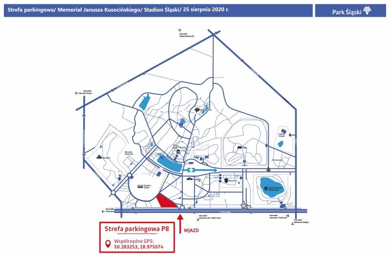 We wtorek (25 sierpnia) na Stadionie Śląskim odbędzie się memoriał Janusza Kusocińskiego. Jeżeli ktoś wybiera się na to wydarzenie samochodem, to zachęcamy do skorzystania ze strefy parkingowej P8, która została zaznaczona na poniższej mapie.
